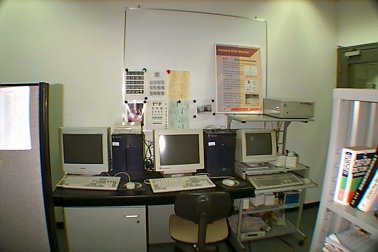 After having some ideas of how the room looked like, it is time to explain why the Glass Room existed and where did its name come from. In the photo, there are three computers. The one on the right is a normal 486DX PC, but the two in the middle used to be the star of the whole lab. They were so expensive and advanced that a room was built to accomodate them. The film "Terminator II" were produced by workstations like these! They were the SGI INDIGO WORKSTATIONS. When the room was first built, researchers within the room were not permitted to shut the blinds so that everyone outside the room could marvel at these two state-of-the-art machines through the glass panels on both sides of the room. It was then obvious why the room was called the Glass Room. As Time went by, these two machines were not prestigious any more and by the time I worked in the room, all the blinds were shut. Then further down the track, there was no point to have the room so it was going to be dismantled. It was a good idea to have it taken down so that the general lab area would be bigger, but another incentive (from rumour) was about the budget-every long holiday there would be some renovation somewhere (Got it? ;). These photos were taken just before the destruction of the Glass Room. As far as I know, the two SGI workstations are not not in use anymore. |